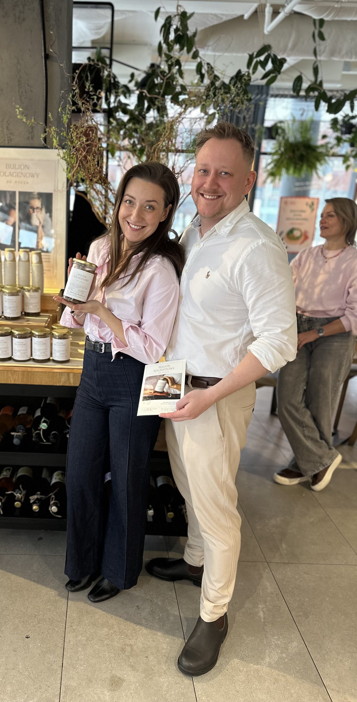 Bulion kolagenowy gotujemy ponad 12 godzin, żeby wydobyć z kości wołowych cały naturalny kolagen i białko. Smak jest delikatny, bo od początku myśleliśmy o osobach, które nie przepadają za intensywnym aromatem mięsa. Tak było u nas w domu – moja żona od ponad 9 lat nie je mięsa, ale gdy lekarz zalecił jej kolagen, postanowiłem zrobić taki wywar, który będzie mogła pić z przyjemnością.